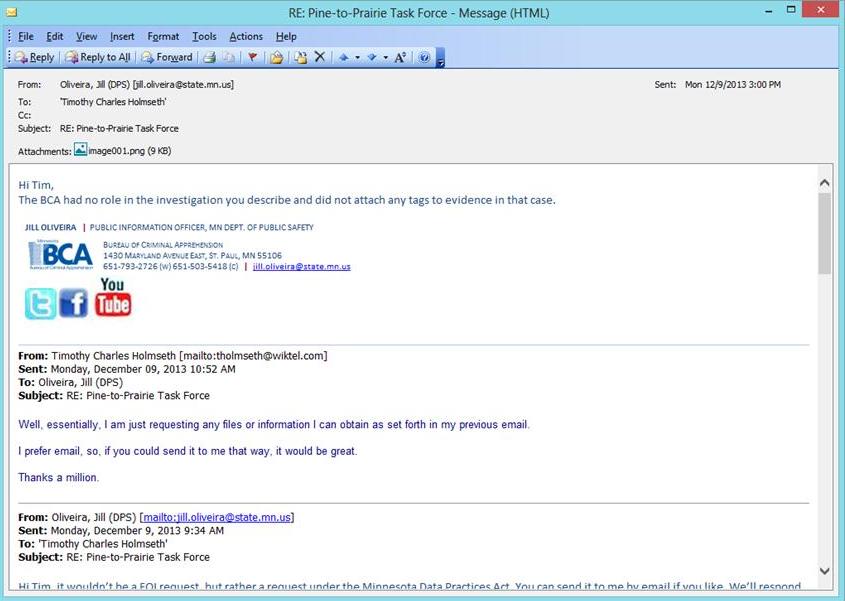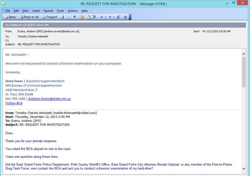Drew Evans, superintendent, BCA, said the BCA played no role in the operation and knew nothing about it. “Mr. Holmseth – we were not asked to conduct a forensic examination of your computer,” Evans said in a 2013 email.