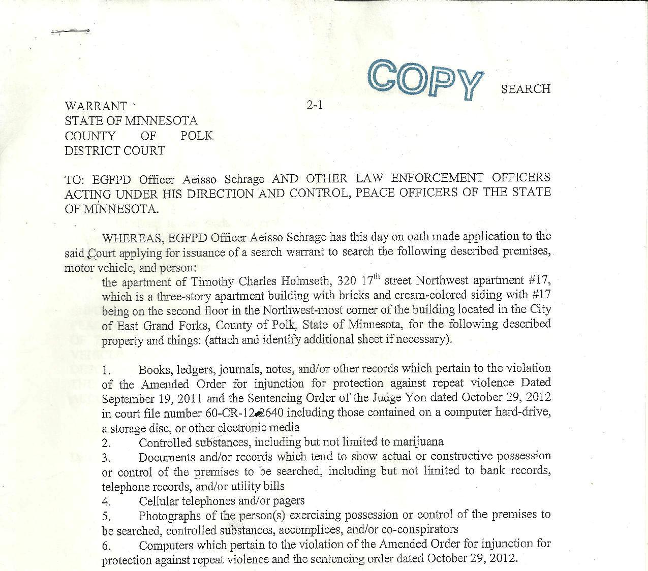 Records show Galstad and the EGFPD obtained a search and seizure warrant from Minnesota District Judge Jeff Remick for Holmseth’s computer – but the warrant made no mention of the child porn. Rather, it was drafted to make Holmseth appear to be a drug dealer.