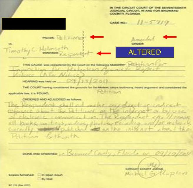 Building on the false police and CPS reports… in 2011, a person that had been identified by a legal assistant in Florida as possessing child pornography of HaLeigh Cummings, petitioned a Broward County domestic violence court for an Injunction For Protection Against Repeat Violence against Holmseth. ‘Repeat Violence’ is a Florida dating law that did not apply to Holmseth because he had no relationship with Petitioner and had not been to Florida.